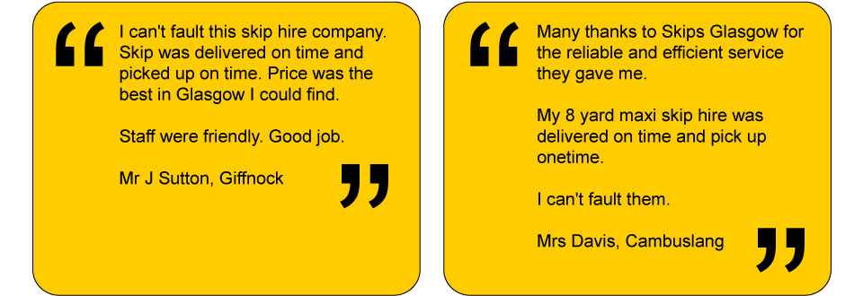 Skips Glasgow is renowned for their first class skip hire service. Skips Glasgow is a family run business offering cheap skip hire throughout Glasgow, Paisley, East Renfrewshire and Lanarkshire areas. We have acquired an honourable reputation which has transpired from years of experience and excellent customer care. Skips Glasgow aren't a call centre as we offer friendly approachable advice and rely on repeat business and recommendations .